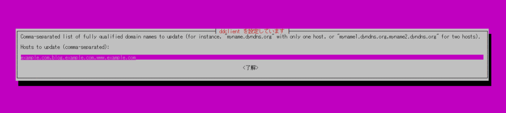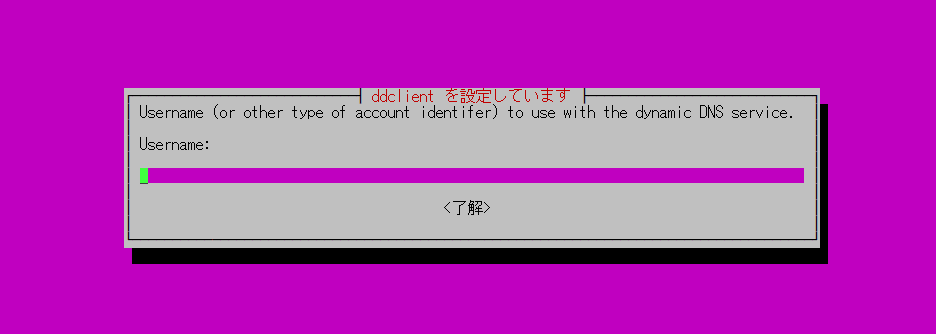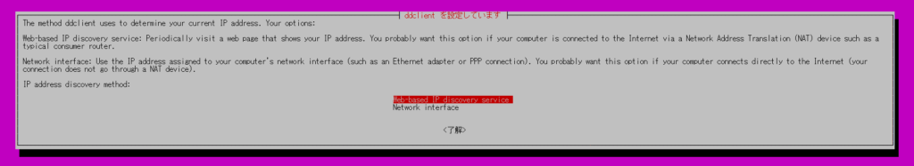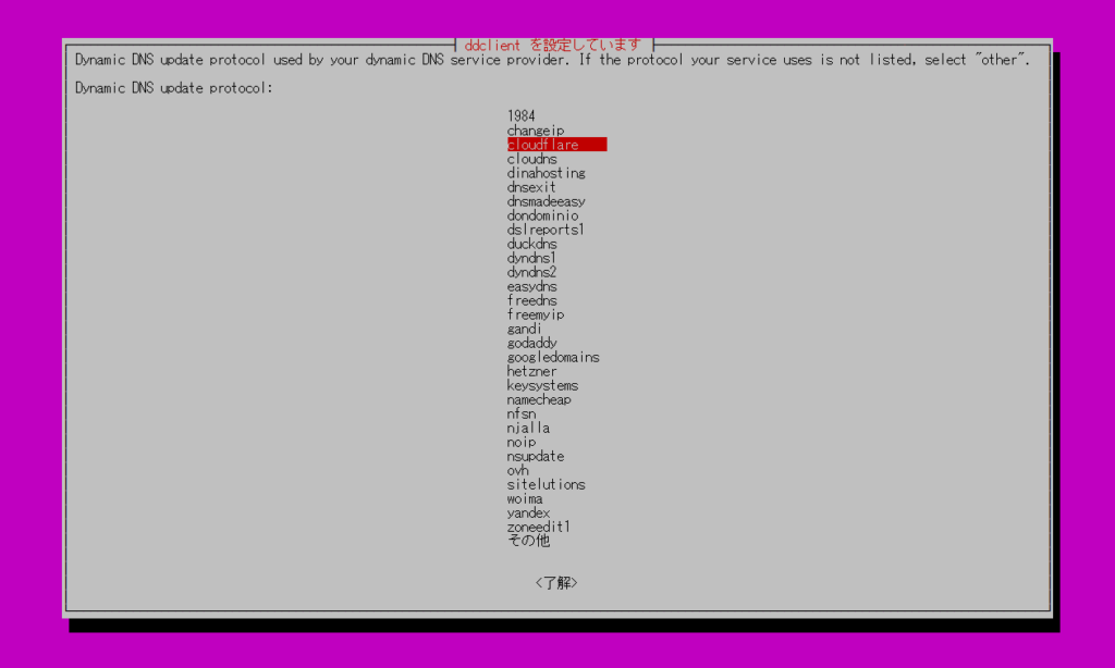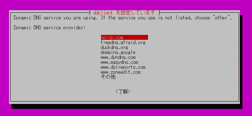 dpkg -i ddclient_3.11.2-2_all.deb最初の画面ではDDNSサービスを選択しますが、ここにはないのでその他を選択。