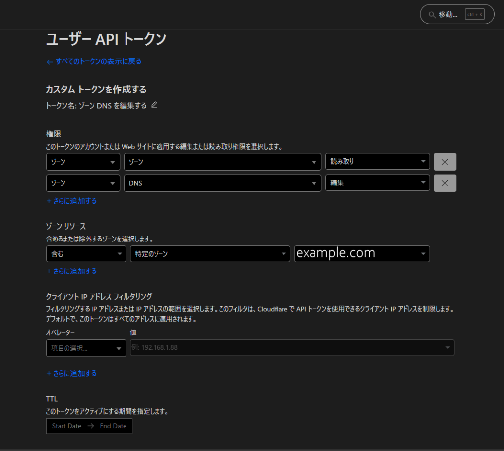 ユーザープロフィール → APIトークン → トークンを作成する → ゾーンDNSを編集する の順で選択します。